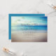 Horizontal beach wedding ceremony invitation template. Personalise in three places with casual text in uppercase printed font for the invitation text and elegant script for the names. Text is grey and black over a serene view of beach sand, blue, waveless water and a horizon of clouds. Rounded edges are optional, and paper upgrades can add to the beauty of the invite. Reverse is solid blue.