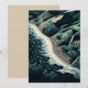 Serene Shores: This stunning top-down illustration captures the harmony of land and sea, featuring waves gently breaking on sandy beaches with lush green mountains in the background. Rendered in soothing shades of dark blue-green, the artwork evokes a sense of tranquility and balance. The intricate detail of the ocean’s patterns meeting the shore, paired with the trees lining the water’s edge, enhances the peaceful atmosphere. Created in a woodcut print style with simple lines and a flat design, the piece is reminiscent of hand-drawn animation, offering a timeless, serene depiction of nature’s beauty.