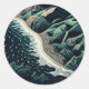Serene Shores: This stunning top-down illustration captures the harmony of land and sea, featuring waves gently breaking on sandy beaches with lush green mountains in the background. Rendered in soothing shades of dark blue-green, the artwork evokes a sense of tranquility and balance. The intricate detail of the ocean’s patterns meeting the shore, paired with the trees lining the water’s edge, enhances the peaceful atmosphere. Created in a woodcut print style with simple lines and a flat design, the piece is reminiscent of hand-drawn animation, offering a timeless, serene depiction of nature’s beauty.