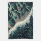 Serene Shores: This stunning top-down illustration captures the harmony of land and sea, featuring waves gently breaking on sandy beaches with lush green mountains in the background. Rendered in soothing shades of dark blue-green, the artwork evokes a sense of tranquility and balance. The intricate detail of the ocean’s patterns meeting the shore, paired with the trees lining the water’s edge, enhances the peaceful atmosphere. Created in a woodcut print style with simple lines and a flat design, the piece is reminiscent of hand-drawn animation, offering a timeless, serene depiction of nature’s beauty.