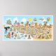 Bright and detailed whimsical vision of Southern California - featuring Los Angeles and San Diego and Orange County plus many major cities and most beach towns - zany characters play on the beach and desert, mountains and valleys. This charming scene has it all – a surfer hangs ten while a mermaid lounges on a rock, a killer whale leaps out of the water as a t-rex roars a challenge, a muscular beach couple both flex to impress, zoo animals wait for tourists and a bull smashes into a bull fighter… And MUCH more...