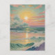 A vibrant and tranquil painting of a sunset over the ocean. The sun, a brilliant white orb, is surrounded by a radiating golden halo that dominates the upper half of the canvas. The sky is a blend of soft blues, pinks, and yellows, with wispy clouds tinted in similar pastel shades. Below, the ocean is a dynamic scene of breaking waves in a deep teal, with the water reflecting the golden light of the sun. The gentle waves roll onto a sandy shore, and the overall composition creates a sense of peace and natural beauty.
