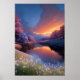 Bask in the Serene Sunset's Embrace, where the golden hues of twilight envelop a calm lake nestled amidst a tapestry of breathtaking flora. The tranquillity of the lake is enhanced by the vibrant beauty of the surrounding plant life. Surrender to the enchantment of this artwork as you imagine yourself by the water's edge, immersed in the peaceful ambiance and captivated by the colourful spectacle of nature.