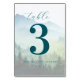 This wedding table card features a serene nature-inspired design with misty mountains and evergreen trees in soft pastel greens and blues, creating a tranquil atmosphere. The layout is balanced and centred, showcasing a bold teal numeral "3" and elegant cursive typography for the word "table." Customisable elements allow for personalisation with names and dates, making it perfect for weddings or formal gatherings. The abstract yet recognisable landscape evokes feelings of calmness and romance, ideal for setting an inviting and harmonious mood at your special event.