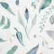 This is a seamless watercolor print on a white background. The design is arranged assorted shape leaves in shades of teal, sage, and dusty lavender, pastel.