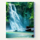 Journal in an illustration of a cascading waterfall in pale blue with white spray, surrounded by boulders and green leaves
