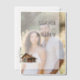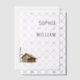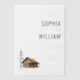 This elegant wedding invitation features a minimalist layout with ample negative space, creating a clean and sophisticated look. The design includes a watercolor illustration of a rustic log cabin beside an evergreen tree, adding a touch of nature to the neutral palette of whites, greys, and earthy tones. Serif fonts in varying weights provide a classic feel, emphasizing the names while maintaining readability for all details. Perfect for couples seeking a serene and inviting atmosphere, this template is customisable, allowing you to personalise it for your special day.