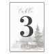 This elegant wedding table card features a minimalist design with a large, bold number "3" centered on the page, accompanied by the word "table" in a stylish cursive font. The background showcases a serene winter scene with soft watercolor illustrations of snow-covered trees and a cozy cabin, creating a tranquil and inviting atmosphere. The color palette includes cool whites, grays, and subtle greens, enhancing the wintry theme. Customizable text fields allow for personalization with names and dates, making it perfect for special occasions like weddings or celebrations.