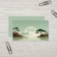 Define your brand with tranquil serenity and striking natural elegance using this captivating business card. The design centers on a breathtaking Asian-inspired waterscape under a pale, hazy sage green sky. A massive, luminous white or pale gold sphere (representing the sun or moon) dominates the center, beautifully framed by distant, misty mountains. The foreground features a still, reflective lake or body of water, with twin shores anchored by gnarled bonsai-style pine trees and vibrant floral clusters. These clusters showcase abundant deep red and soft pink roses, creating a powerful contrast against the cool, quiet landscape. This artwork captures the balanced solitude of a hidden Zen garden, resulting in a unique and sophisticated brand statement that conveys peace and vitality. This business card is ideally suited for a spiritual advisor or wellness coach emphasizing balance and natural energy, a boutique travel agency promoting scenic Asian retreats, or a fine art print seller specializing in serene, atmospheric works. It would also perfectly suit a landscape architect whose focus is on artistic, tranquil garden designs, or a tea room proprietor looking to convey a refined, peaceful experience.