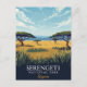 This vintage-style travel postcard captures the classic, iconic beauty of the Serengeti National Park in Tanzania. The illustration features the vast, golden savanna with characteristic Acacia trees under a dramatic, wide blue sky. Perfect for travel enthusiasts, wildlife lovers, or anyone who dreams of an African safari adventure. A unique memento from East Africa's most famous wilderness.