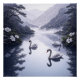 This soft-toned landscape depicts a tranquil lake surrounded by misty mountains and forests, with swans gliding gracefully. The calm water reflections and delicate flowers create a scene of peace and natural beauty, a serene retreat in untouched nature.