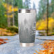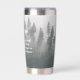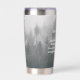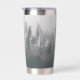 A trendy, stainless steel, thermal tumbler for your hot or cold drink that features a wrap-around photo image of a misty, foggy, evergreen forest along with the inspirational words of the Serenity Prayer printed in white, stylised script.