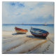 "Serenity Shores". A tranquil seascape, where azure waters meet the gentle kiss of golden sands. Rowboats rest peacefully, adding to the serene charm. A stylised watercolour in gentle blues and hues of fine sand.