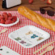 Baby shower plates featuring illustration of baby bodysuits representing Sesame Pals Big Bird, Cookie Monster, Oscar the Grouch, Bert, Ernie, and Abby Cadabby. Personalise by adding your name and shower date!