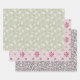 A trio of wrapping paper with a folksy floral and leaves design. The green and pink sheets have a textured background. This set is suitable for any special celebration.