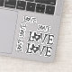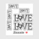 Distressed western lettering of the word "LOVE" with the "O" replaced by the state of Texas with a heart cut out of it. Available in UT Longhorns burnt orange, Texas A&M Aggies maroon, Texas Tech Raiders red, black, state flag blue, cactus green and periwinkle purple. On the extra-small sheet, the large sticker is about 2" wide, the small stickers 1" wide.