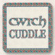 A set of six smart coasters with the Welsh word 'cwtch', meaning 'cuddle' or 'hug' in a Celtic script, as well as 'Cuddle' in English, in a Red and Blue ethnic pattern on a linen-effect background.