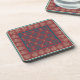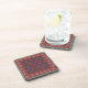 A set of six elegant, square, cork-backed coasters, with a formalised floral pattern in beige and dark blue on a rich burgundy background.