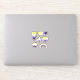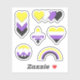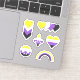 Custom-cut vinyl stickers with a variety of designs in the colours of the non-binary pride flag; the included shapes: a peace sign, hearts, a fleur-de-lis, pencils, and a rainbow