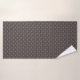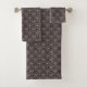 Set of patterned towels with a classic damask design. The top image shows a folded towel on a rod, and the bottom image displays a square washcloth partially folded.