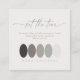 This colour palette enclosure card is the perfect addition to our minimalist wedding suite. Featuring a beautiful neutrals colour scheme from dark charcoal to softest bone white, this insert card allows you to share your chosen wedding colours with your guests. Whether you're planning a formal affair or a casual celebration, this enclosure card is a stylish way to communicate your wedding's aesthetic. If necessary, change the colour of each oval by clicking "Edit Using Design Tool" and choosing "Fill Colour" to choose a colour. Add your wedding website, QR code and names on the reverse using the provided template. Coordinates perfectly with matching wedding invitations and other stationery items in this design set, found by searching ID1020.