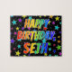 This lively and fun birthday-themed jigsaw puzzle design features the message "HAPPY BIRTHDAY, SETH" with the characters having a colourful rainbow spectrum inspired gradient pattern, in addition to an exciting star field background pattern. An exciting puzzle like this might be a fun way to acknowledge the birthday of somebody named Seth. [~Z0000468]