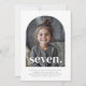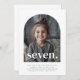 A simple 7th Birthday invitation featuring your own photo in an arch shape and the words 'seven.' over the top.