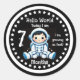 The image features an adorable, cartoon-style illustration of a child dressed in a white and blue astronaut suit. The child is seated with legs spread out and hands resting on the ground. The suit includes a helmet with a clear visor, blue accents, and buttons on the chest area. The black background makes the character stand out prominently. This charming depiction combines the innocence of a child with the adventurous theme of space travel, creating an engaging and delightful visual.