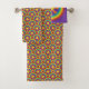 This funky towel set features a groovy graphic pattern inspired by the 1970s with overlapping discs in a rainbow of colours centred with a sun with slightly twisted rays. Edit design to change the purple background hue.