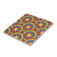 This colourful ceramic tile features a groovy graphic pattern inspired by the 1970s with overlapping discs in a rainbow of colours centred with a sun with slightly twisted rays. Edit design to change the purple background.