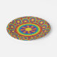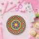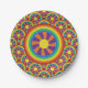 This colourful paper plate features a groovy graphic design inspired by the 1970s with overlapping discs in a rainbow of colours centred with a sun with slightly twisted rays. Edit design to change the background hue.