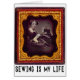 Real photograph of a Victorian woman hard at work on her 'state-of-the-art' sewing machine, along with a fun custom logo: Sewing is My life!