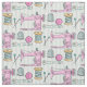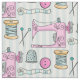 A cute sewing pattern featuring a sewing machine, thread, measuring tape, thimble and more.