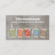 Spools of colourful thread, sewing pins and needles with shabby chic grey/brown background on seamstress, alterations or sewing business card, or for 'handmade with love' gift tags for your sewing hobby.