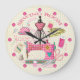 Get sewing with this stylish Sewing Room wall clock. This fun Sewing Room clock has a Sewing theme featuring various sewing equipment including a Sewing Machine, needle and thread, tape measure, cotton threads and other couture items, and in place of numerals it has cute pink buttons around its face! This Sewing room clock will look fabulous in your sewing room and keep perfect time! It makes a great gift too! This sewing room design is also featured on other great products in the Stand Up and Cheer store.