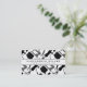 Stylish business card features a modern black and white sewing pattern with grey accounts. A fun and whimsical pattern of sewing machines, dress forms, fabric, needles, thread, buttons and sewing shears with custom name and title or role presented on a black banner with white text and accents. The back of the card is plain and simple with coordinating black text on a plain white background.