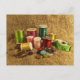 This colourful postcard displays the tools of the seamstress. Bright spools of thread in rainbow colours of green, red, pink, turquoise, yellow, gold, blue and orange stand beside a measuring tape, thimble, buttons and pins. All are set on an image of a brown burlap pattern background.