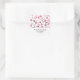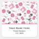 An address sticker featuring a sewing themed design consisting of a sewing machine, spools of thread, a pin cushion, scissors, fabric swatches, and sewing needles. Design has a pink colour scheme.