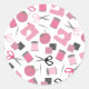 A sticker featuring a sewing themed design consisting of a sewing machine, spools of thread, a pin cushion, scissors, fabric swatches, and sewing needles. Design has a pink colour scheme.