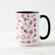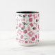A mug featuring a sewing themed design consisting of a sewing machine, spools of thread, a pin cushion, scissors, fabric swatches, and sewing needles. Design has a pink colour scheme.