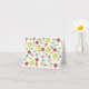 A notecard featuring a sewing themed design consisting of a sewing machine, spools of thread, a pin cushion, scissors, fabric swatches, and sewing needles. Design has a retro orange, yellow, red, and blue / turquoise colour scheme.