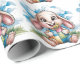 A watercolor illustration of a baby rabbit with a patchwork body. The rabbit has floppy ears and is wearing a yellow pacifier in its mouth. The rabbit is smiling and has a cute expression. The background is white with blue skies.