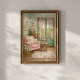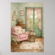 A cosy shabby chic interior featuring a pink armchair, floral pillows, and a charming garden view through vintage doors. Soft roses, pastel colours, and delicate floral patterns create a warm cottage-style reading nook filled with gentle vintage charm.