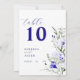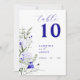 The wedding table number card features a prominent number “10” in an elegant red font at the centre. The left side of the card is adorned with a beautiful floral design in shades of blue, ivory, and grey, complemented by green foliage. The white background enhances the vibrant colours, making this table number card a stylish and sophisticated choice for wedding receptions. Ideal for couples seeking elegant and memorable table decor for their special day.