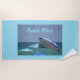 Beach umbrellas in colourful shades of blue under the sun with a tropical sea and clear blue sky in the horizon are featured on this beautiful Beachy customisable beach towel ideal for Beach Lovers.