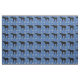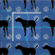 A black shadow silhouette of a German Shorthaired Pointer dog standing against a blue background with paw prints and track sin blue, pink and grey.