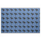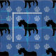 A black shadow silhouette style Schnauzer on a background of blue with paw prints and tracks of grey, blue and pink.