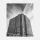 A towering building rises from the city against a stark black-and-white sky, its sharp lines and geometric forms commanding attention. A lone bird flies past, its small silhouette contrasting with the structure’s massive presence, adding a fleeting sense of life to the bleak metropolis.