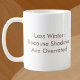 Brighten your day with this playful coffee mug that reads, "Less Winter: Because Shadows Are Overrated." Perfect for Groundhog Day enthusiasts or anyone who dreams of shorter winters and more sunshine. Whether you're sipping your morning coffee, tea, or hot cocoa, this mug adds a touch of humour and seasonal charm to your routine. It’s an ideal gift for those who love witty, weather-themed designs and practical drinkware. Start your day with a smile and some warmth!