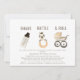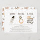 This boho and gender-neutral "shake, rattle and roll" baby shower by mail invitation features a white background with a baby bottle, a zebra rattle, and a baby stroller. The reverse side features a white background with baby toy patterns. Personalise it for your needs. You can find matching products at my store.